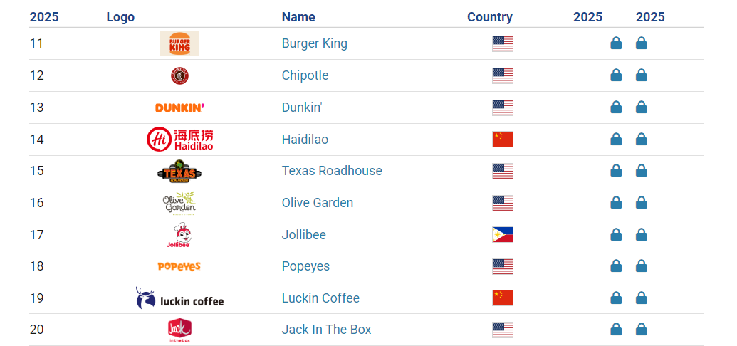 而一众中国品牌,如海底捞、瑞幸,也首次同时跻身全球前二十,引发行业广泛关注。
