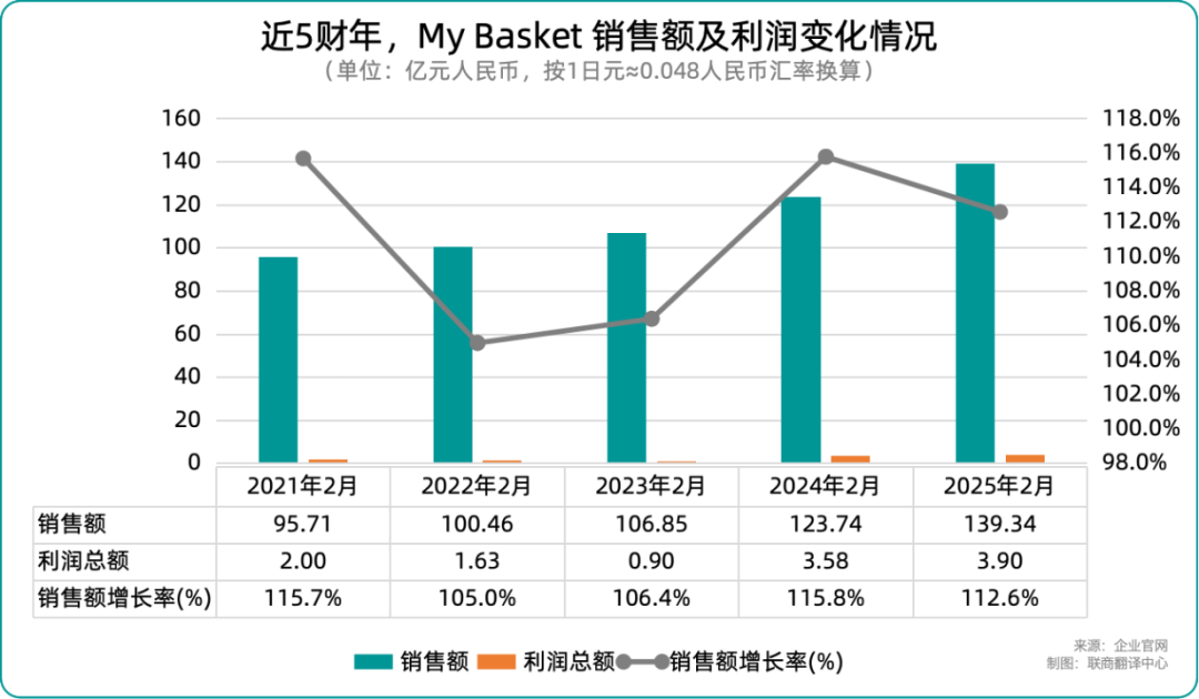在永旺集团整体营业利润下滑的背景下,My Basket 却展现出强劲的增长曲线。2025财年,销售额约2903亿日元(约139亿人民币),利润近3.9亿人民币,占永旺食品超市板块利润的四分之一。